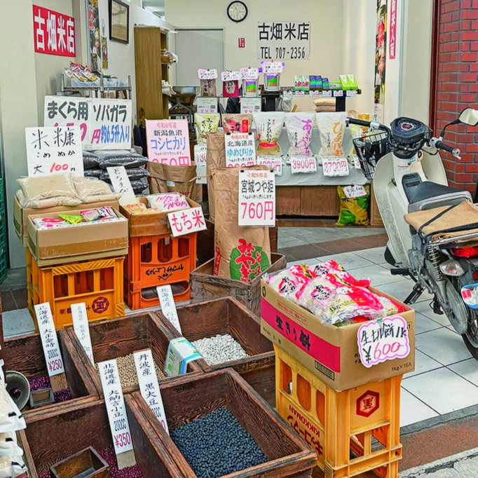 レトロな雰囲気のお米屋さん。店頭には年季の入った木製の箱の中が並び、丹波産の黒大豆や北海道産の小豆などが売られています。枕用の蕎麦殻も!垂水センター街の中でも歴史の古い店です。