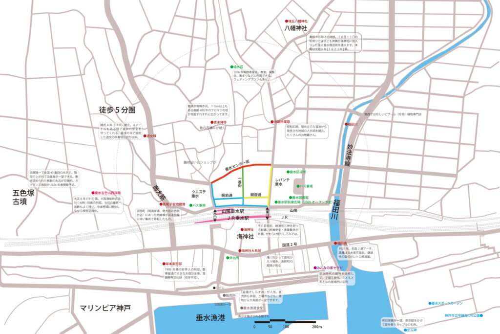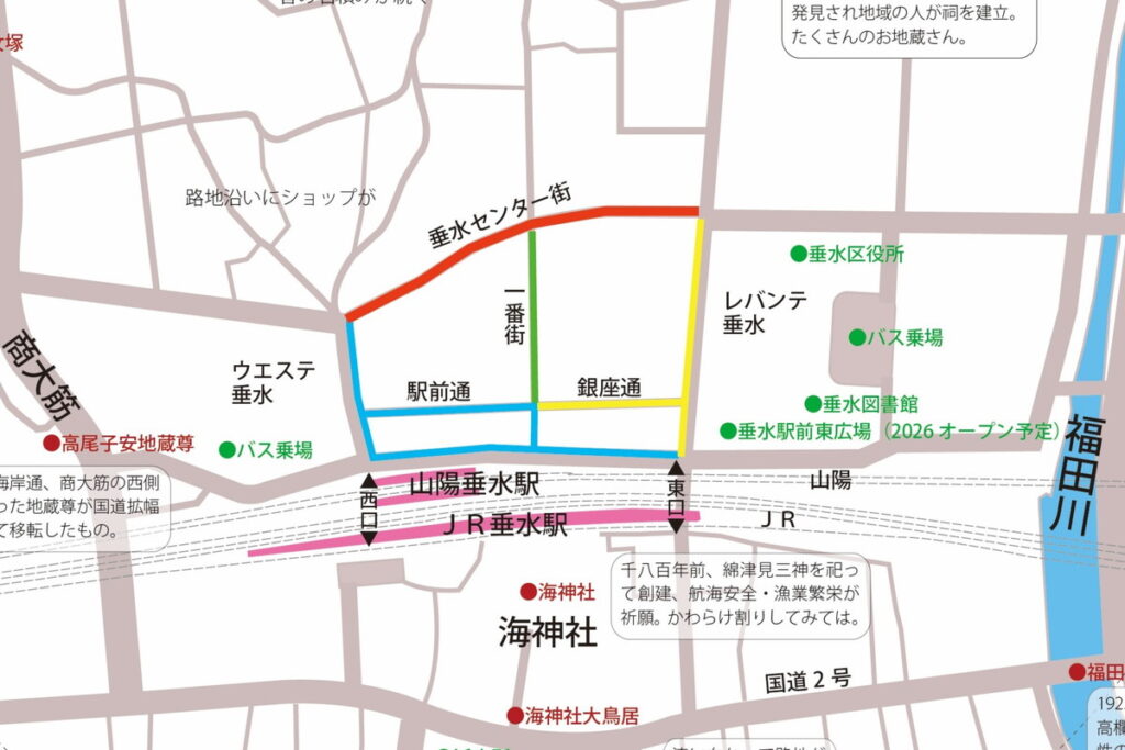 商店街は垂水の海と丘に囲まれ、漁港や歴史的な建物、古墳、社寺やお地蔵さん、スポーツ施設なども集まっていて、伝統的なお祭りも行われます。散歩しながらお買物するのにとても便利で楽しいエリアです。